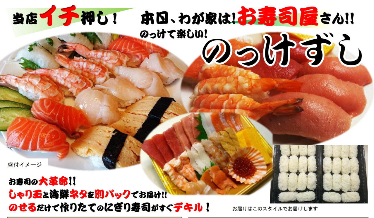 うまか寿司はここ注目しました!「ネタ」と「シャリ」を分けて配達すれば、新鮮なネタは冷たいまま、暖かいシャリは暖かいまま、食べる寸前に乗っける事により、一番おいしい瞬間をお客様へ届ける事が出来るのではないか!と言うところからこの「のっけ寿司」を開発しました。